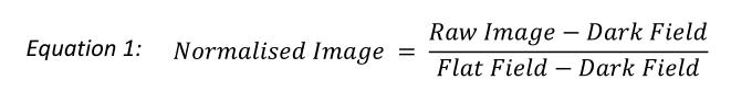 使用ImageJ軟件對圖像記錄并進行處理,對每一個數據組、平均暗場信號、平場校正信號以及樣品成像進行編譯。首先從一組參考的背景圖中獲取出平均背景信號;為了估算出平場信號,我們從每一個平場信號中減去平均背景,平場信號減去背景而后進行歸一化和平均處理這樣就可以得到平均平場校正信號;為了得到有效的目標信號,對所有的目標圖像進行背景扣除、歸一化處理而后除以平均平場信號。調整對象堆棧的大小可以改變相機曝光時間。通過將平均目標圖像除以平場信號,這樣可以使增益帶來的變化以及固定模式噪聲最小化【7,12】。最后處理得到的圖像再進一步分析。