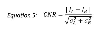所有的平場圖像、背景圖像以及模型圖像都對像素靶面39872個像素區域進行了歸一化處理,以校正曝光期間的光束強度和增益變化。從得到的圖像進行分析,20個不同對比度材料的截面的邊緣附近不均勻,假設是由于邊緣效應,包括光束發散、中子散射和沿著每個截面之間的尖銳邊界的衍射而引起的。對于上述提到的5 mm正方形部分的模型材料,在其中心附近選擇32 x 64像素進行ROI分析,并計算像素值的平均值和標準偏差。相鄰兩段(A和B)之間的CNR定義為