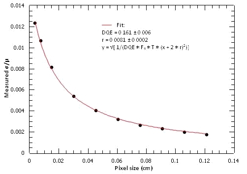 R2 = 0.999625 Figure 9: Fit to standard deviation as a function of pixel size using Equation 4, parameterized with QEeff and r.