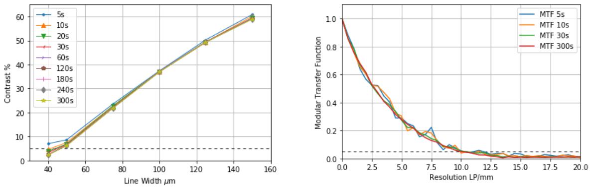 如圖5所示,將曝光時間從300秒減少到30秒不會影響測量的對比度或計算的MTF曲線。將曝光時間減少到30秒以下,測量對比度和計算的MTF曲線的趨勢相同,但引入了更多的噪聲,如圖6所示。然而,MTF曲線小于5%的點保持在9.5–10.5 lp/mm之間 。