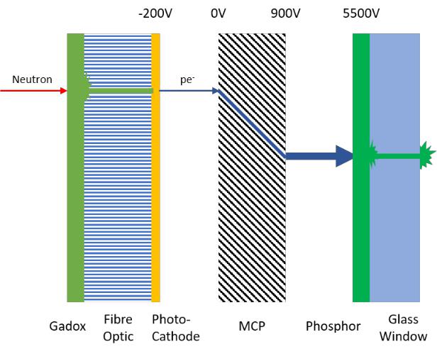 N-Cam探測器部分包含一個厚度為20 µm、密度為7.3mg/cm2的Gadox閃爍體同時具有75mm靶面的有效探測區域。一個厚度為1mm的發黑鋁材料(防止低能量X射線干擾,類似X射線相機防止可見光的鈹窗)被放置在Gadox閃爍體前端2.7mm處,這樣就使待測對象與Gadox閃爍體之間的最小距離為3.7 mm。Gadox閃爍體直接應用于Photek 的MCP175像增強器的光纖輸入窗口前端。光纖輸入的數值孔徑(NA)為1.0,保證了閃爍體光的高收集效率。典型的中子和閃爍體材料互相作用會產生30kev的內部電子沉積【8,9,10】,從而在閃爍體的平均電子路徑上會形成1200個光子的計數。大約32%的光信號會通過光纖窗口傳輸到光電陰極。在此次實驗中閃爍體由于沒有反射覆蓋層以最大化優化空間分辨率,造成了一部分的光損失。同時在光纖窗口的內表面沉積的S20光陰極在閃爍體545nm發射峰位置提供了10%的量子效率。通過上述的計算得出,每吸收一個中子,在像增強器端會產生38個光電子;這些產生的光電子會在光陰極和微通道板之間的300um空間,通過一個200v的電壓加速。微通道板MCP是一個有數百萬個孔的薄玻璃板,可以用來放大電子信號【11】。N-Cam中子相機系統配置有一級MCP,該MCP具有直徑為12um間距為15um的陣列孔,孔徑比L:D是60:1。MCP的增益是由電壓控制的,對于大多數測試設置為+900v。通過MCP放大后的光電子通過5.5kv的加速電場轟擊P46熒光屏并輸出成像。在上述的電壓增益過程中,增強器的總光增益可達104。