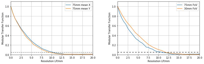 Figure 7: Mean calculated MTF curve of resolution chart in X and Y direction    Figure 8: Mean calculated MTF curves at the center of N-Cam FoV