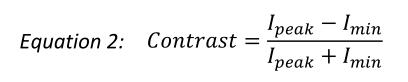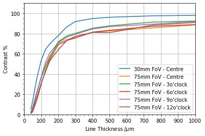 處理圖像后,在第一和第二組線對(25-1000um)成像中重現出多條線陣的輪廓。同時對于不同線對的尺寸用方程二進行對比度計算。計算圖像的MTF模式傳遞函數邊緣效應,使用了ImageJ軟件插件,針對邊緣ROI區域進行定義分析。
