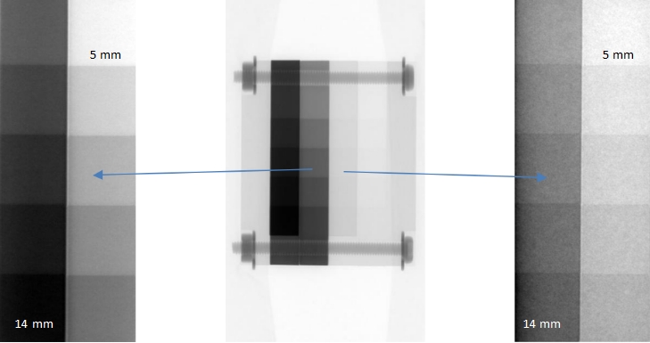 10a) Copper step-wedge from 5 to 14mm in 1 mm steps    10b) Contrast Phantom    10c) Aluminum Step-wedge from 5 to14 mm in 1 mm steps