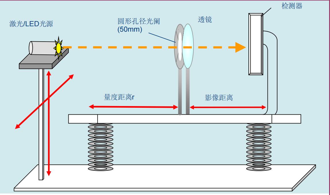將光源、透鏡、光闌、光斑儀等固定于產品測試架上,并將其與測量透鏡水平對齊,如下圖搭建好測試光路。