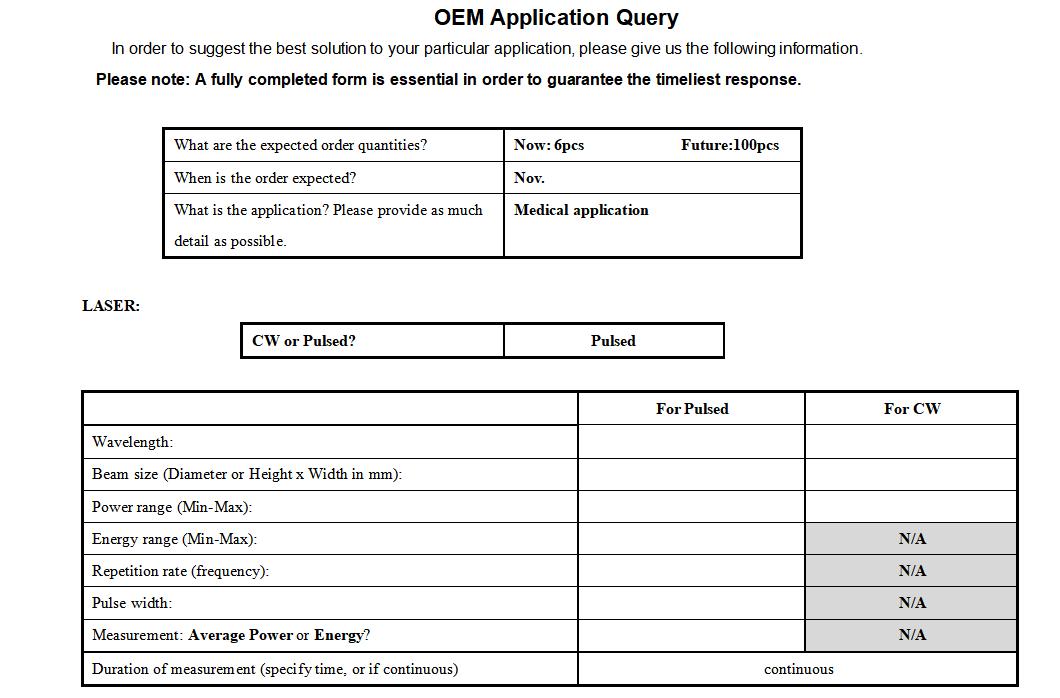 功率能量OEM探頭OPHIR原廠可以根據客戶的指定校準波長以及指定功率進行研發和生產OEM探頭,大大提高了探頭的針對性以及性價比,信號輸出方式RS232 / Analog output / USB等可選。