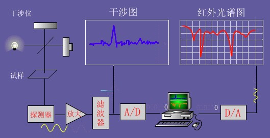 工作原理:光源發(fā)出的紅外輻射,經(jīng)干涉儀轉(zhuǎn)變成干涉圖,通過試樣后得到含試樣信息的干涉圖,由電子計算機(jī)采集,并經(jīng)過快速傅立葉變換,得到吸收強(qiáng)度或透光度隨頻率或波數(shù)變化的紅外光譜圖。干涉圖從數(shù)學(xué)觀點講,就是傅立葉變換,計算機(jī)的任務(wù)是進(jìn)行傅立葉逆變換。