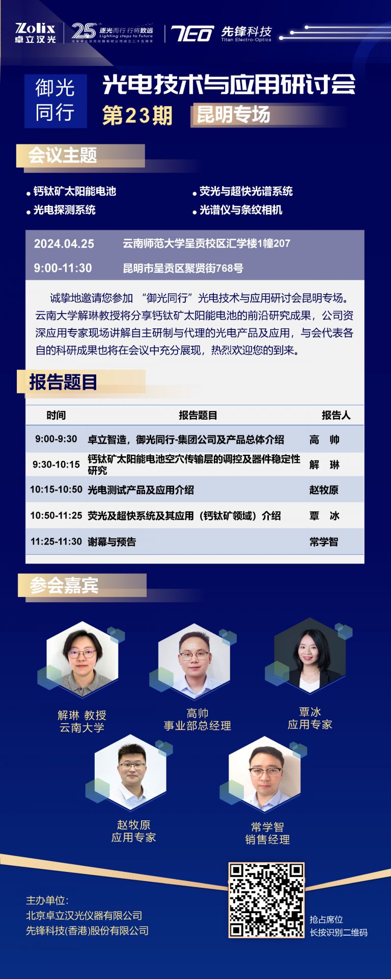 由先鋒科技與卓立漢光聯(lián)合舉辦的第23期“御光同行”光電技術(shù)與應(yīng)用研討會(huì)昆明專場將于2024年4月25日上午9:00-11:30在昆明召開。