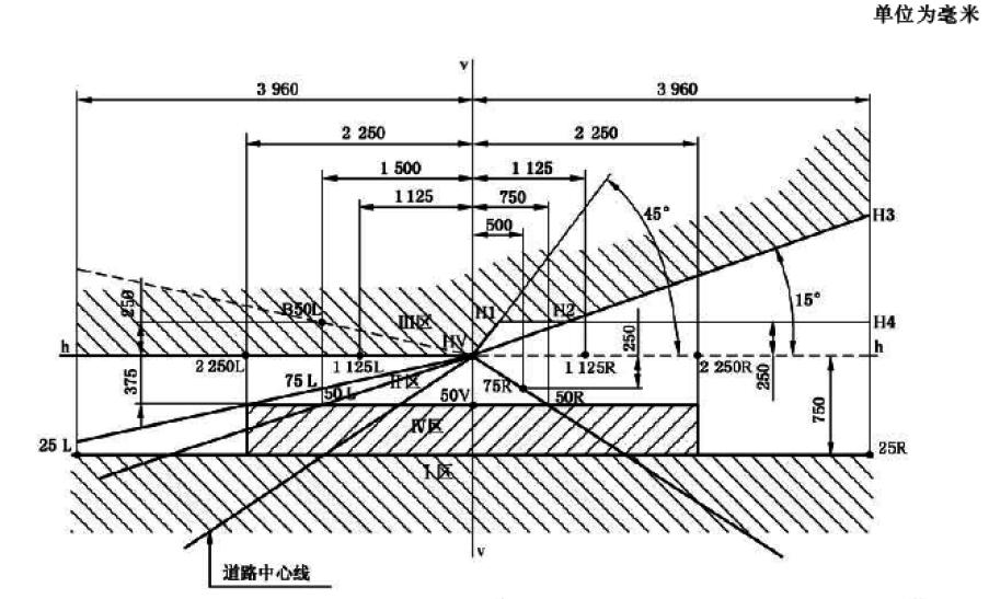 圖中HV點對應前照燈的中心點,v線對應右車道中心線。圖中劃分了I、Ⅱ、Ⅲ、Ⅳ區,對應于路面和前方的不同位置,還標出了若干測試點,如B50L