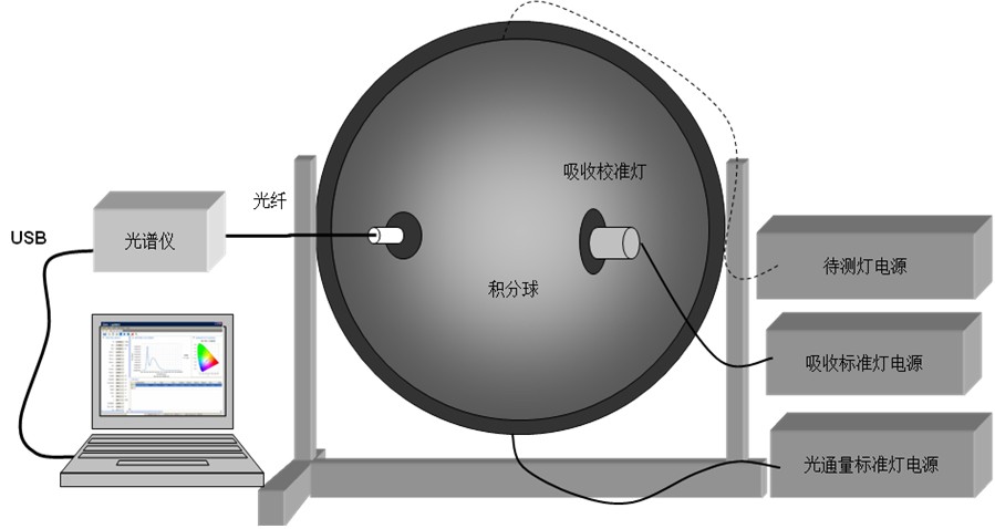 如下圖所示,為LED光源積分球測試系統示意圖。