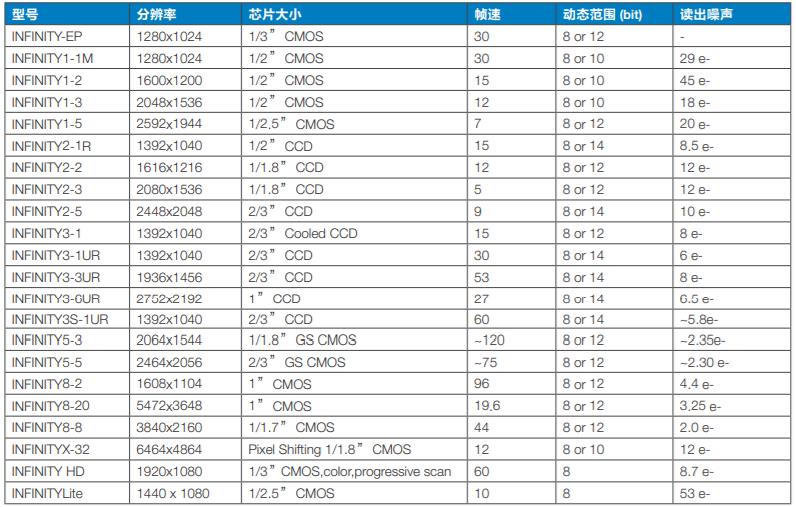 加拿大Lumenera公司的INFINITY系列高性能相機參數: