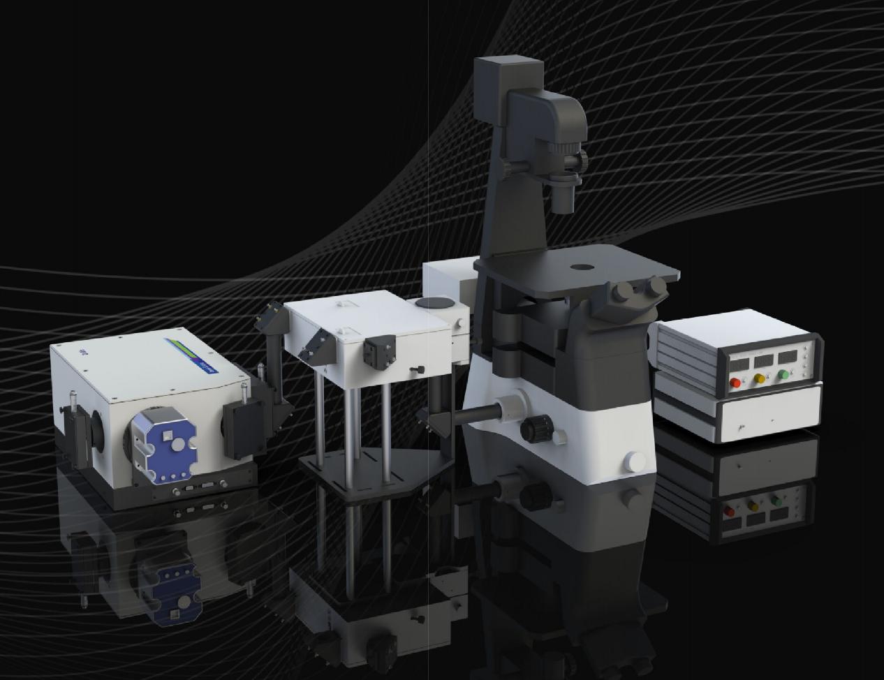 結(jié)構(gòu)二:在卓立漢光自主研制的標準RTS 顯微共聚焦拉曼光譜儀的基礎(chǔ)上配置具有雙層無限遠光路的倒置顯微鏡,上層光路多光阱光鑷系統(tǒng),拉曼激光從顯微鏡的側(cè)口進入,拉曼信號原路返回接光譜儀,可內(nèi)置不同波長激光器,也可外部耦合激光器,拉曼信號通過光纖或者空間光路耦合到光譜儀,光路如下: