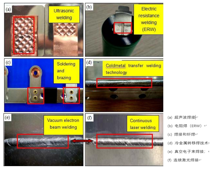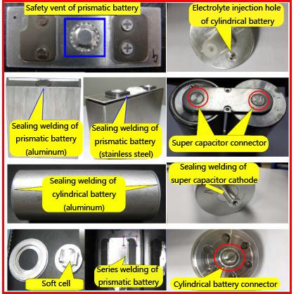 動力電芯常見幾種激光焊接位置,即蓋板安全口、電芯&極柱、電池殼、密封銷(電解液注入孔)、電池極耳、電芯極耳和頂蓋。此外,超級電容器的焊接位置主要是連接器和陰極(封焊)。超級電容器和不同類型動力電池的激光焊接位置如圖所示: