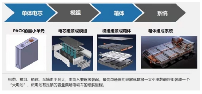 這三種電池目前都用于電動汽車的生產中,其中棱柱形電池和圓柱形電池應用比較廣泛。不同形狀的動力電池具有不同的焊接工藝參數。電池從電芯到成型示意圖如下,焊接是這個過程中非常重要以及復雜的工藝。