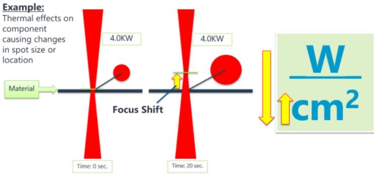 1. 功率檢測發現激光器功率與初始沒有改變,但是工作效果依然變差,這個其實是激光聚焦的焦點位置發生了改變(也就是我們常說的焦點飄移),最終導致工作點位置功率密度下降,從而達不到實際工作效果。
