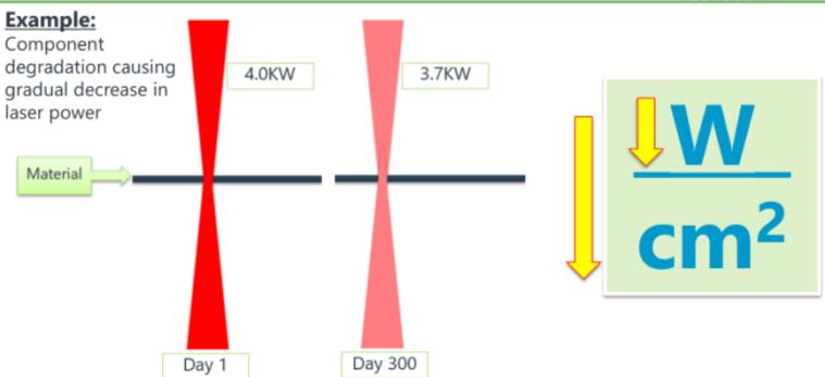 隨著使用時間的增加,實際切割或者焊接的時候會發(fā)現(xiàn)質(zhì)量變差,最直接的體現(xiàn)就是在同樣激光參數(shù)設(shè)置下,樣品不能被切割開或者焊接變差出現(xiàn)虛焊等現(xiàn)象,這個是由于激光功率變化造成的,功率下降后最終在樣品工作點位置功率密度下降造成的,此時需要調(diào)節(jié)激光參數(shù)從而達(dá)到最初設(shè)置;