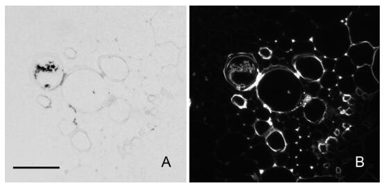 圖1 同一樣品明場(A)、暗場(B)像對比