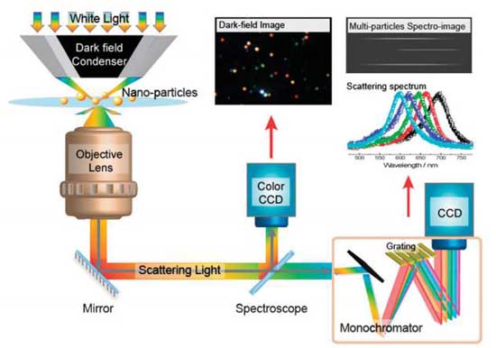 位于襯底、溶液、膠體或細胞中的金屬納米顆粒/團簇是典型的均一樣品中的小尺度結構,因此暗場顯微技術是一種非常有效的觀測手段。更為有趣也更為重要的特性是,因為納米顆粒的介觀特征、表面活性,它們對電磁波的響應既不同于單獨的原子/分子,也不同于長程有序的晶體。因此除了暗場散射成像以外,進一步研究此類粒子散射光的光譜特征,有助于理解納米顆粒的尺度,狀態,動力學過程,以及與周邊環境的相互作用信息。暗場散射光譜廣泛用于金屬納米顆粒研究,表面納米結構研究,納米管及納米線,以及Plasmon Ruler等。