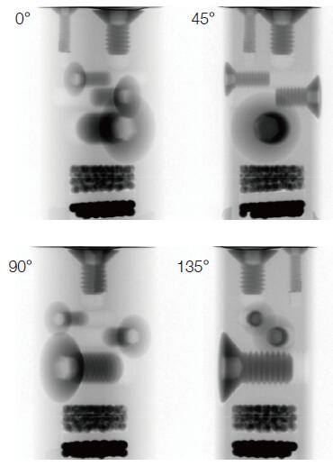 不同角度X 射線成像: 鋁材料覆蓋的M3-M8 鈦螺絲、銅球以及硼硅球