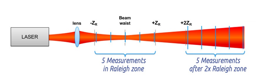 ISO規范了一種從一組光束直徑測量值中計算M²因子的方法,以最大限度地減小誤差。在測量過程中,激光束首先需要用高光學質量、已知焦距的透鏡聚焦。然后,使用陣列探測器或掃描狹縫輪廓儀在光束的不同位置測量光束寬度。