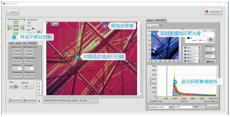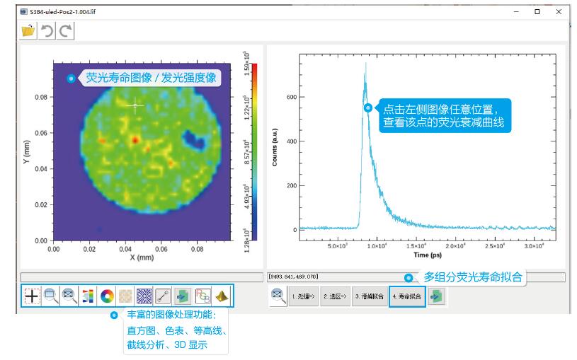 控制功能:控制樣品平移臺(tái)移動(dòng),通過(guò)顯微鏡的明場(chǎng)光學(xué)像定位到合適區(qū)域, 框選掃描區(qū)域進(jìn)行掃描,逐點(diǎn)獲得發(fā)光衰減曲線,實(shí)時(shí)生成發(fā)光圖像等 數(shù)據(jù)處理功能:自動(dòng)對(duì)掃描獲得的壽命成像數(shù)據(jù),逐點(diǎn)進(jìn)行多組分發(fā)光壽命擬合 ( 組分?jǐn)?shù)小于等于4),對(duì)逐點(diǎn)擬合獲得的發(fā)光強(qiáng)度、發(fā)光壽命等信息生成偽彩色圖像顯示 圖像處理功能:直方圖、色表、等高線、截線分析、3D 顯示等 |