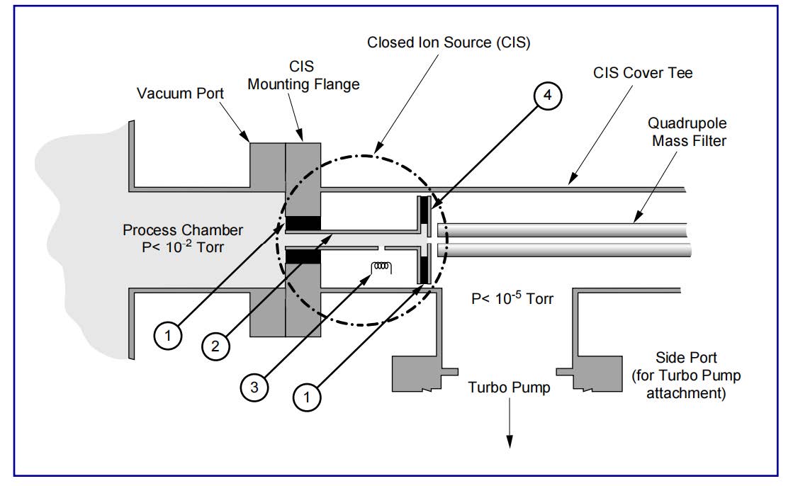 在需要測量10−4和10−2Torr之間的壓力的應用中,通過用封閉離子源(CIS)采樣系統取代傳統的OIS PPR配置,可以顯著減少背景和工藝氣體干擾的問題。一個通用的CIS設置的橫截面如圖3所示。