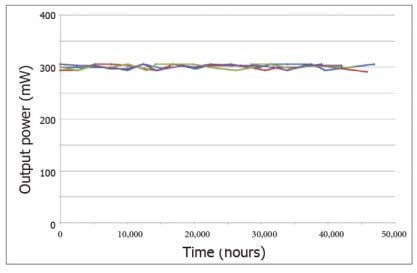 4 款不同的Gem 系列激光器在長(zhǎng)時(shí)間工作后的功率輸出變化圖