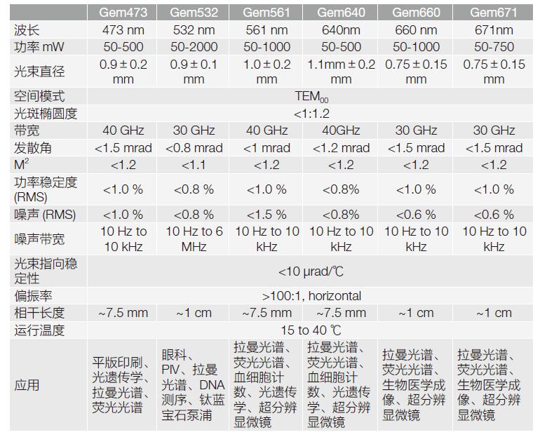 | gem532 | LaserQuantum公司明星產(chǎn)品,高品質(zhì)單橫模衍射極限傳輸連續(xù)綠光激光器,高穩(wěn)定輸出功率達(dá)2W。 | 眼科、PIV、拉曼光譜、DNA測(cè)序、鈦寶石/鈦燃料激光器泵浦、熒光成像、生物醫(yī)學(xué)成像、光刻、激光多普勒測(cè)速儀、光遺傳學(xué) |