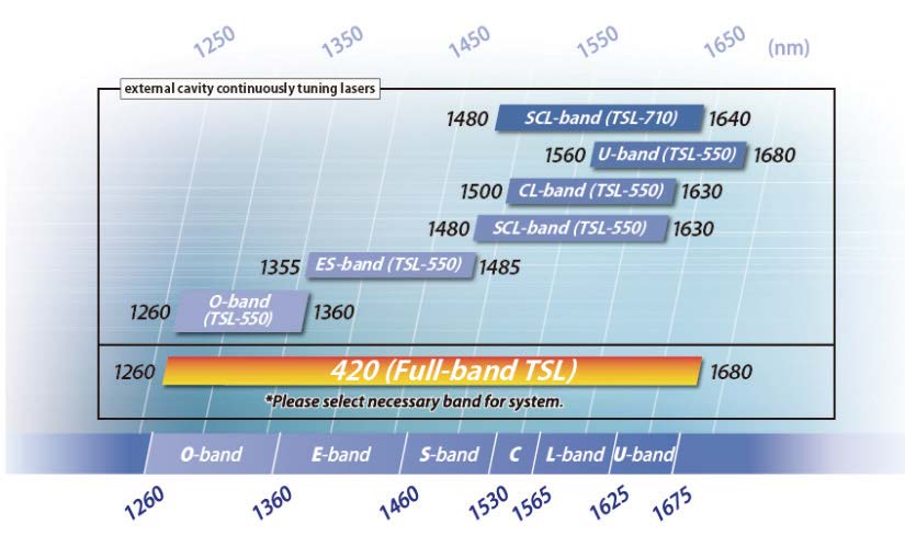 Santec TSL 分為5 系列和7 系列。其中5 系列分為A、C 兩個級別,又按照波段范圍分為O(1260~1350nm)、ES(1355~1485nm)、CL(1500~1630nm)、SCL(1480~1630nm)、LU(1560~1680nm)多個型號;7 系列性能更高,主要針對CL、SCL 波段。