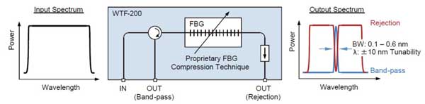 WTF-200 可調諧FBG濾波器采用壓縮FBG的方式進行調節。與傳統的伸展式調節相比,調諧范圍更寬,典型調諧范圍可達20nm。
