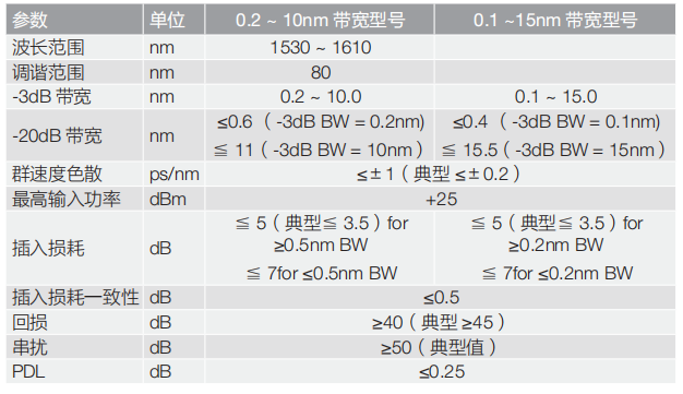 OTF-350平頂型手動波長可調諧光濾波器性能: