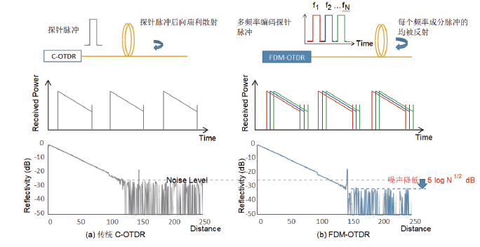 FOTDR-300 頻分復(fù)用相干光時(shí)域反射儀(Frequency-Division-Multiplexed Coherent OTDR) 不同于傳統(tǒng)的C-OTDR。它在同一個(gè)時(shí)間段內(nèi)發(fā)送不同頻率的多個(gè)探針脈沖,從而在同樣的測(cè)試時(shí)間內(nèi)獲取更多的數(shù)據(jù),因此可以在相同時(shí)間內(nèi)獲得更高的信噪比,或者在同等信噪比下大幅度縮減測(cè)量時(shí)間。