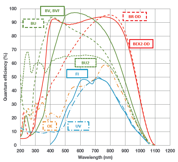 FI:前感光CCD UV :前感光,UV 鍍膜 BV:背感光,可見波段優化 BU:背感光,紫外增強350nm 優化 BU2:背感光,紫外增強250nm 優化 |