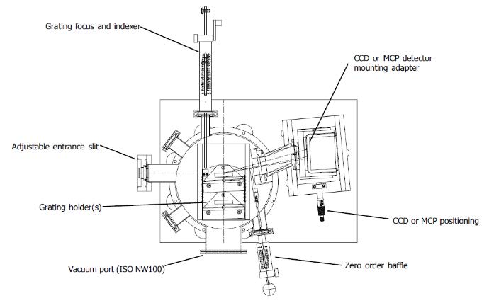 251MX 型相差校正平場光譜儀采用球面基底的光柵和光柵波前非球面用于相差校正。此類高分辨率光譜儀工作在軟X 射線波段。251MX 的長焦距、直的光譜線高分辨率是極紫外理想的光譜儀。251MX 型非常容易獲得良好光柵特性,也可到高質量的光柵。251MX 型可用CCD 相機直接探測高能量光譜、MCP 微通道板像增強器可以作為此套系統作為光學閘門。