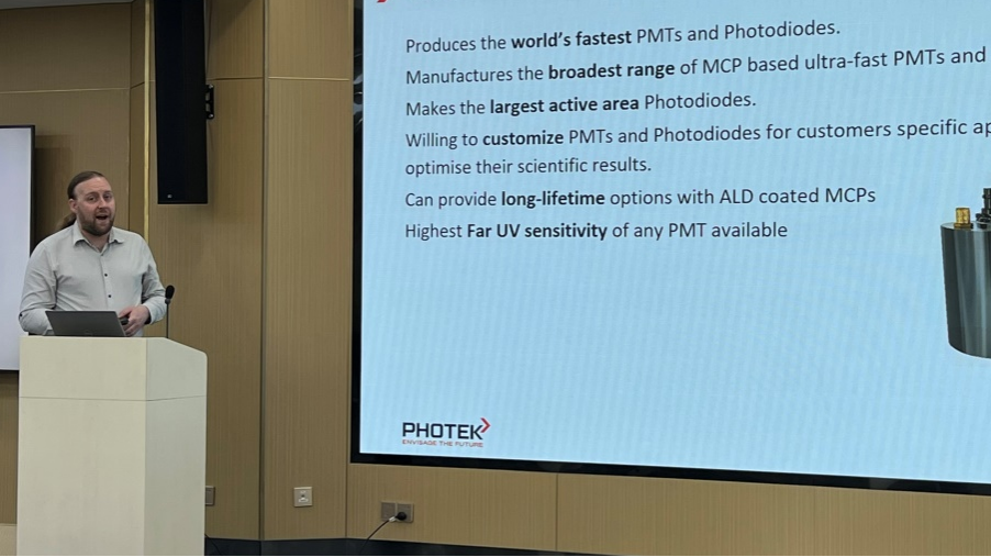 Photek公司銷售經(jīng)理Fenton Mann以及技術(shù)專家Thomas為大家介紹Photek真空離子探測(cè)器及弱光成像類產(chǎn)品。Fenton主要介紹了超快光電倍增管和高分辨率光子計(jì)數(shù)成像系統(tǒng)等超快弱光探測(cè)產(chǎn)品,此外還介紹了真空粒子探測(cè)器在高能光子成像、場(chǎng)離子顯微鏡化學(xué)反應(yīng)動(dòng)力學(xué)、同步輻射及低溫物理領(lǐng)域的應(yīng)用,同時(shí)該產(chǎn)品作為粒子速度影像系統(tǒng)的核心探測(cè)器件目前已經(jīng)在國(guó)內(nèi)的中國(guó)科學(xué)技術(shù)大學(xué)、復(fù)旦大學(xué)上海交通大學(xué)、中國(guó)科學(xué)院物理研究所和上海科技大學(xué)等高校科研院所的原子分子物理實(shí)驗(yàn)室里面廣泛使用。