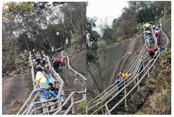 第一天的興奮還未散去,就開始了我們第二天的挑戰(zhàn)之旅。這一天我們挑戰(zhàn)了1638級的祥云梯,來到祥云梯腳下,只見告示牌上寫著“量力而行”四個字,極目望去,高不見頂,內心一陣掙扎,山不在于高,而因為陡,我們彼此相望,互相打氣,踏上這幾乎80°的階梯,然而挑戰(zhàn)并沒有結束,等待我們的還有一條全透明高空景觀玻璃橋,該橋全長316米,橋面通體透明,可以非常清楚地看到谷底的景色,如果在谷底仰望,玻璃上的人影也清晰可見。最終,一個都沒有少,我們登上了祥云梯,也走向更加驚險刺激的玻璃橋。